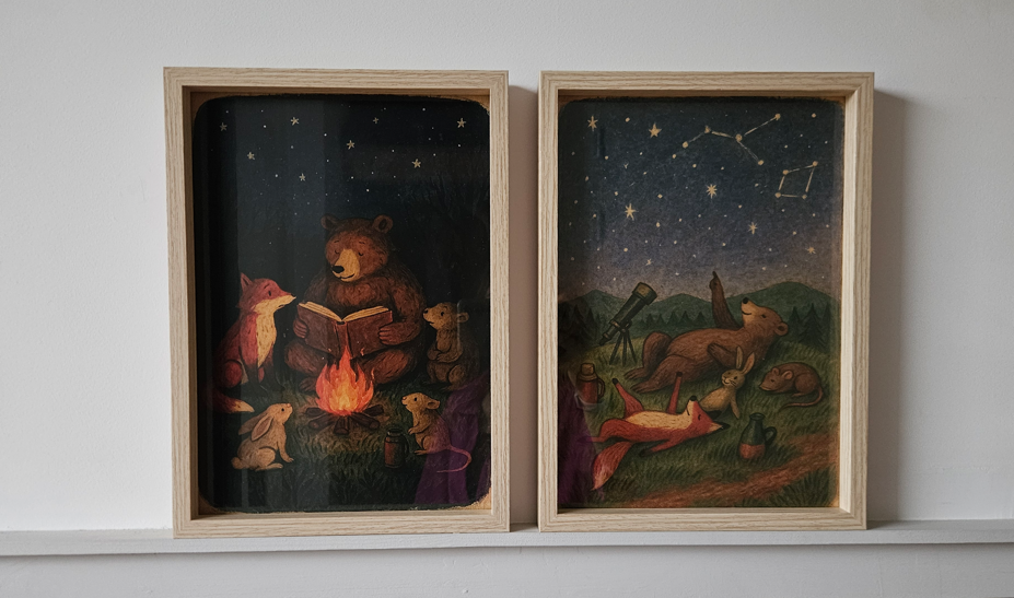 3 ingelijste posters en 5 bijpassende wenskaarten