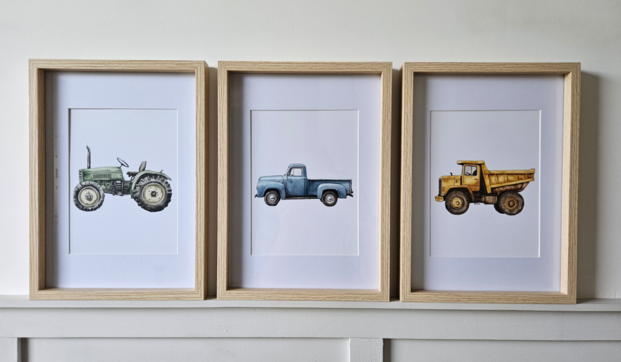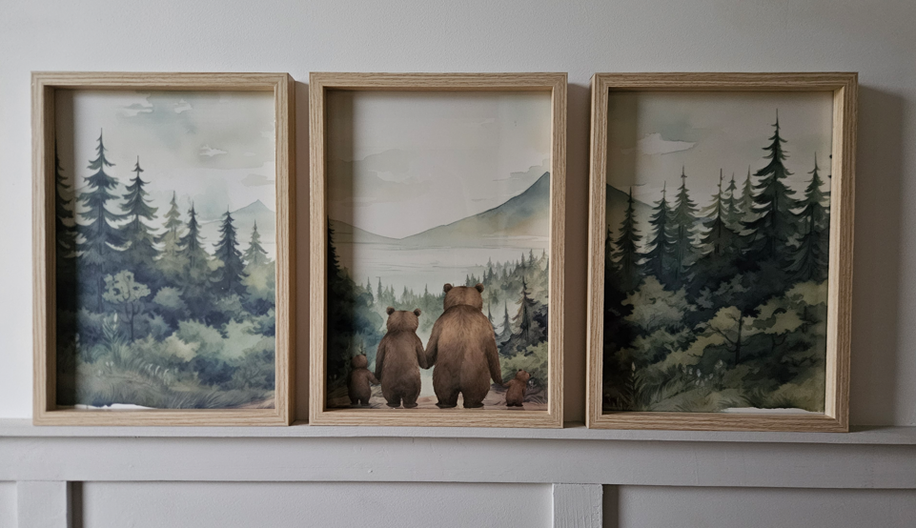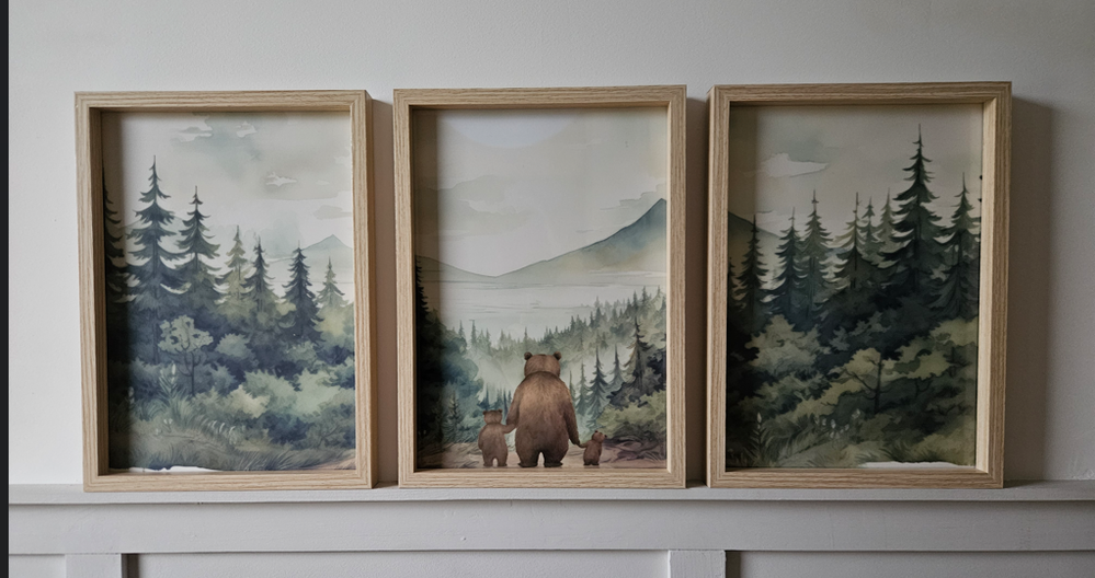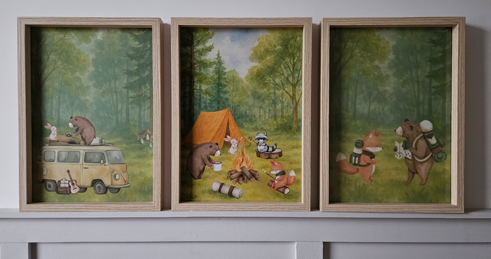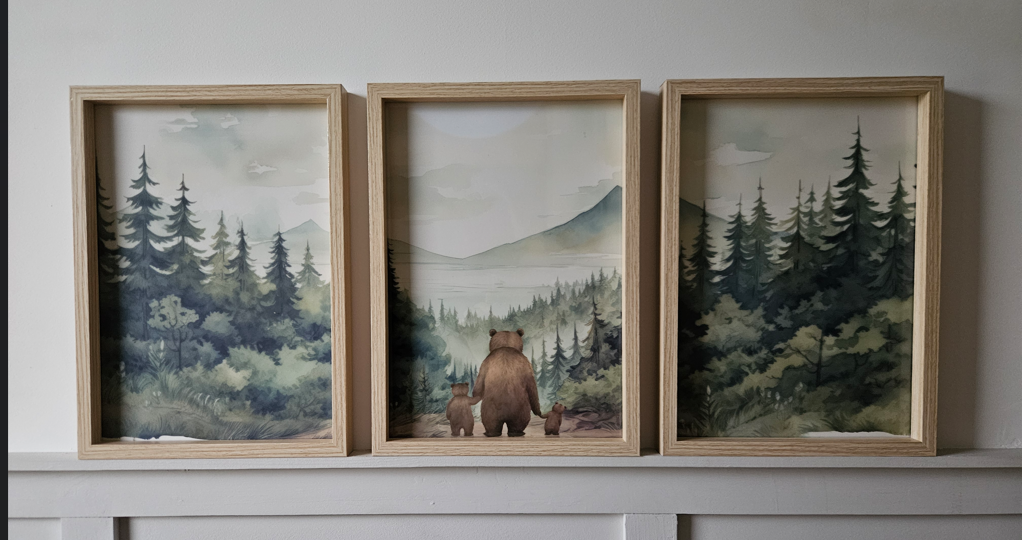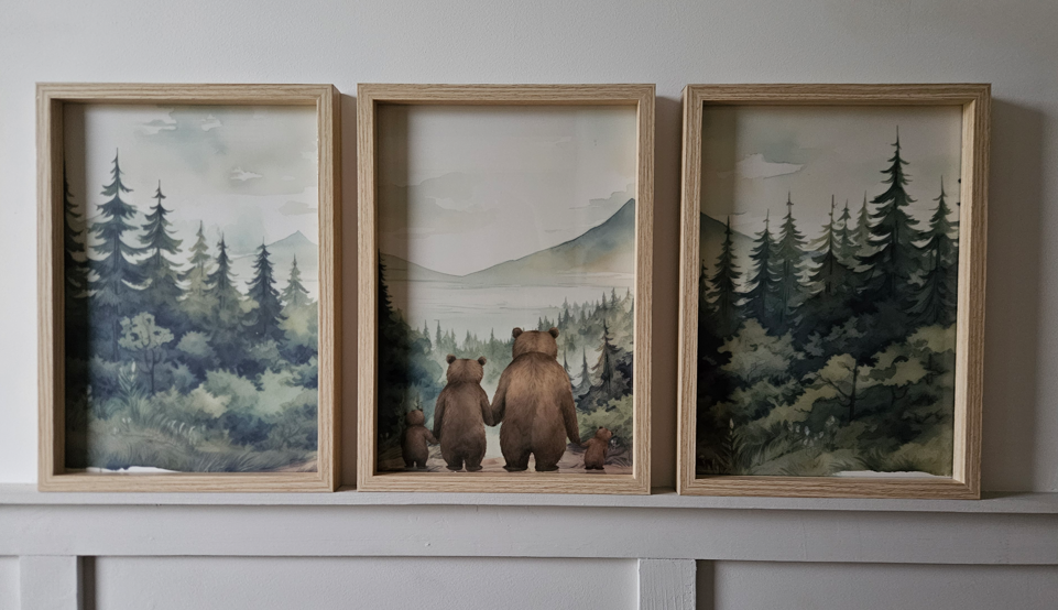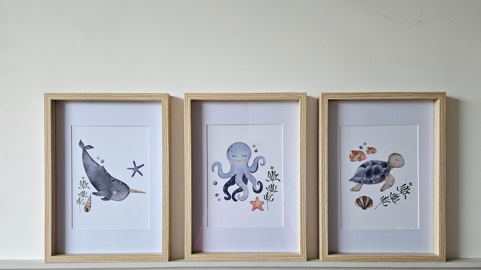 Een set bestaande uit 3 ingelijste posters gedrukt op hoogwaardig papier (300 gram, A4) met een matte afwerking. Leuk voor de baby- of kinderkamer :-)