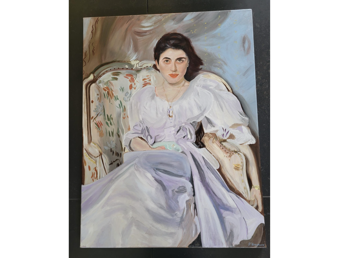 Een mooi schilderij van een dame in een stoel, een replica van de schilder John Singer Sargent die zijn eigen vrouw hier heeft geschilderd. Ik heb dit dus nageschilderd. afmetingen zijn hxbr = 80x60cm